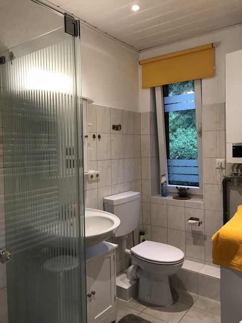 - Im Bad dienen der Sauberkeit eine Dusche, eine Toilette, ein Waschbecken und eine Waschmaschine. Hier ist auch die Heiz- u. Warmwassertherme untergebracht.