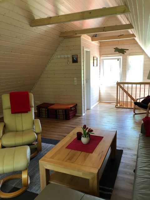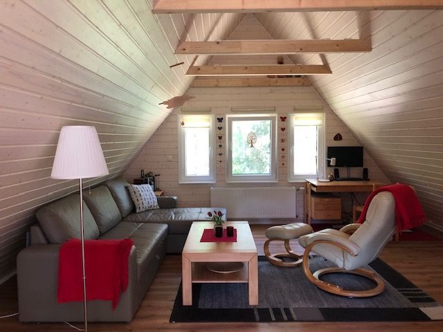 - Das ausgebaute Dachgeschoss besteht hauptsächlich aus einem großen Raum. Hier erwartet Sie ein großes Ledersofa mit Schlaffunktion, ein Arbeitstisch, ein zweites TV-Gerät, das für DVD genutzt werden kann. Ebenfalls im Dachgeschoss befindet sich eine zweite Toilette.